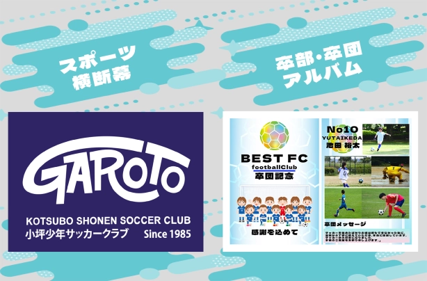 制作物は横断幕、のぼりに加え、大型パネルなどの応援ツールから卒部・卒団記念アルバムなどの、選手一人一人の思い出もカタチにします。